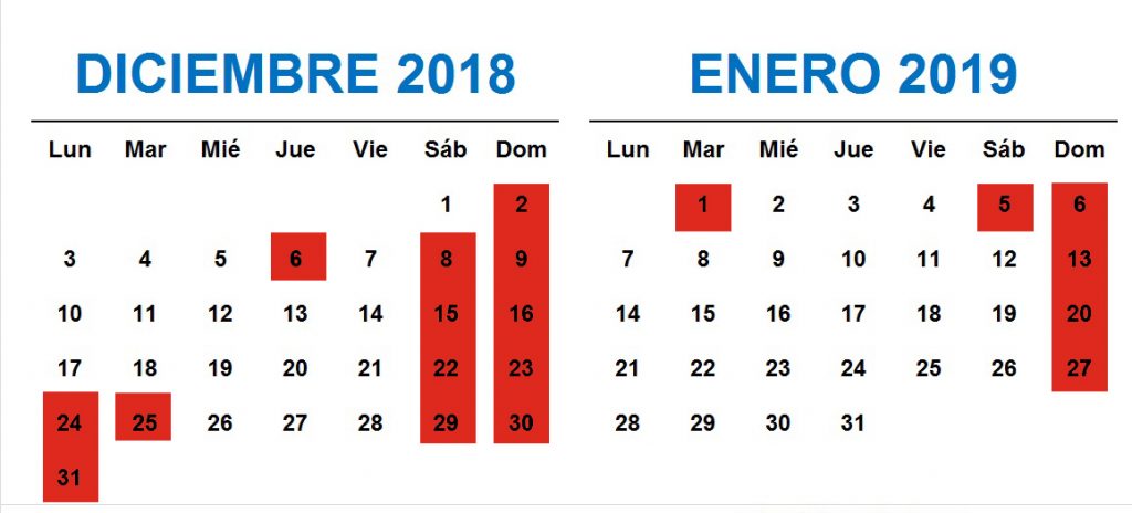 Los días en rojo indican los días cerrados, en blanco los días abiertos al público.