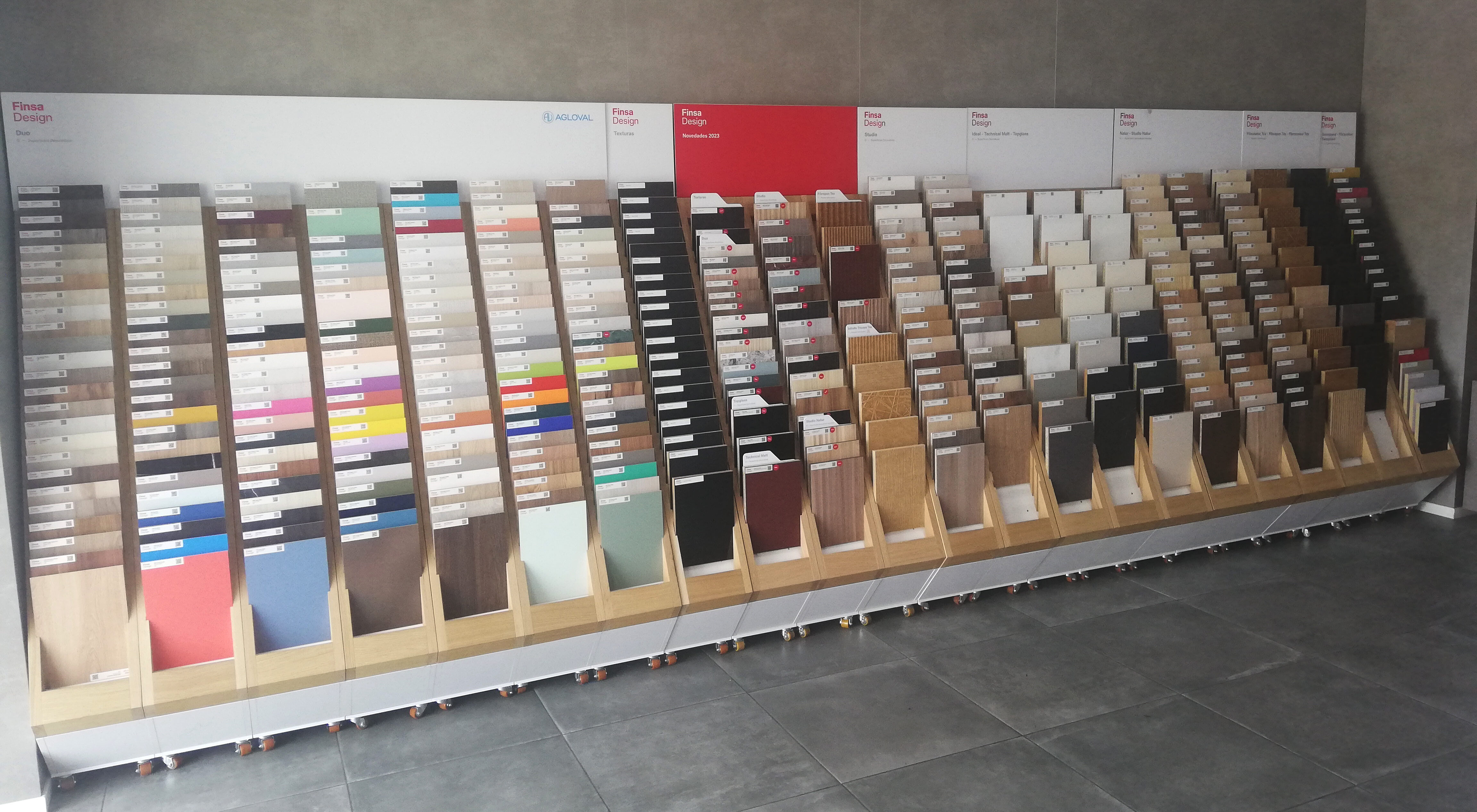 Ven también a visitar el nuevo expositor en nuestras instalaciones. Podrás ver, tocar y seleccionar in situ el acabado que más te guste. O seleccionar aquel que mejor combine y sea más acorde para a tu proyecto. Escoge entre la gama DUO y STUDIO de FINSA el acabado perfecto. Elige entre los colores de stock o los que podemos traer bajo pedido.