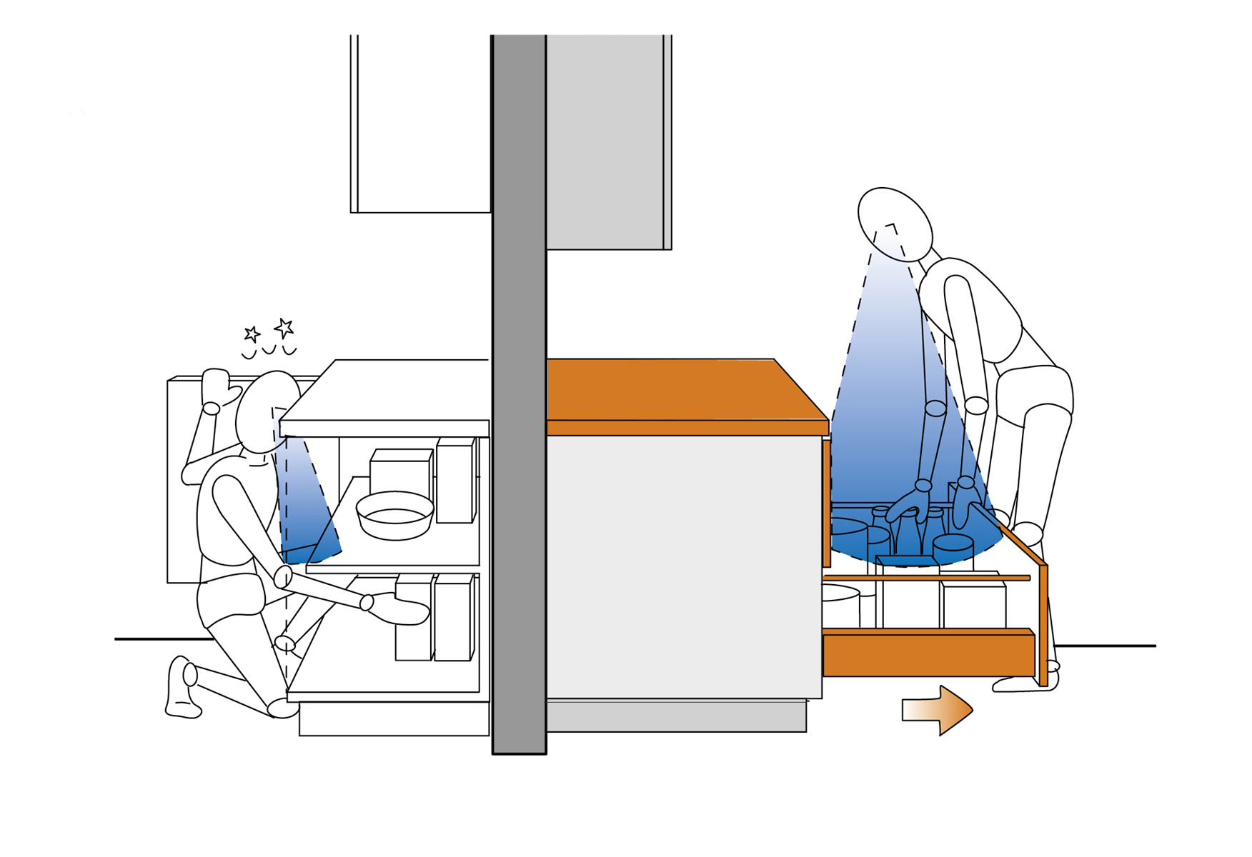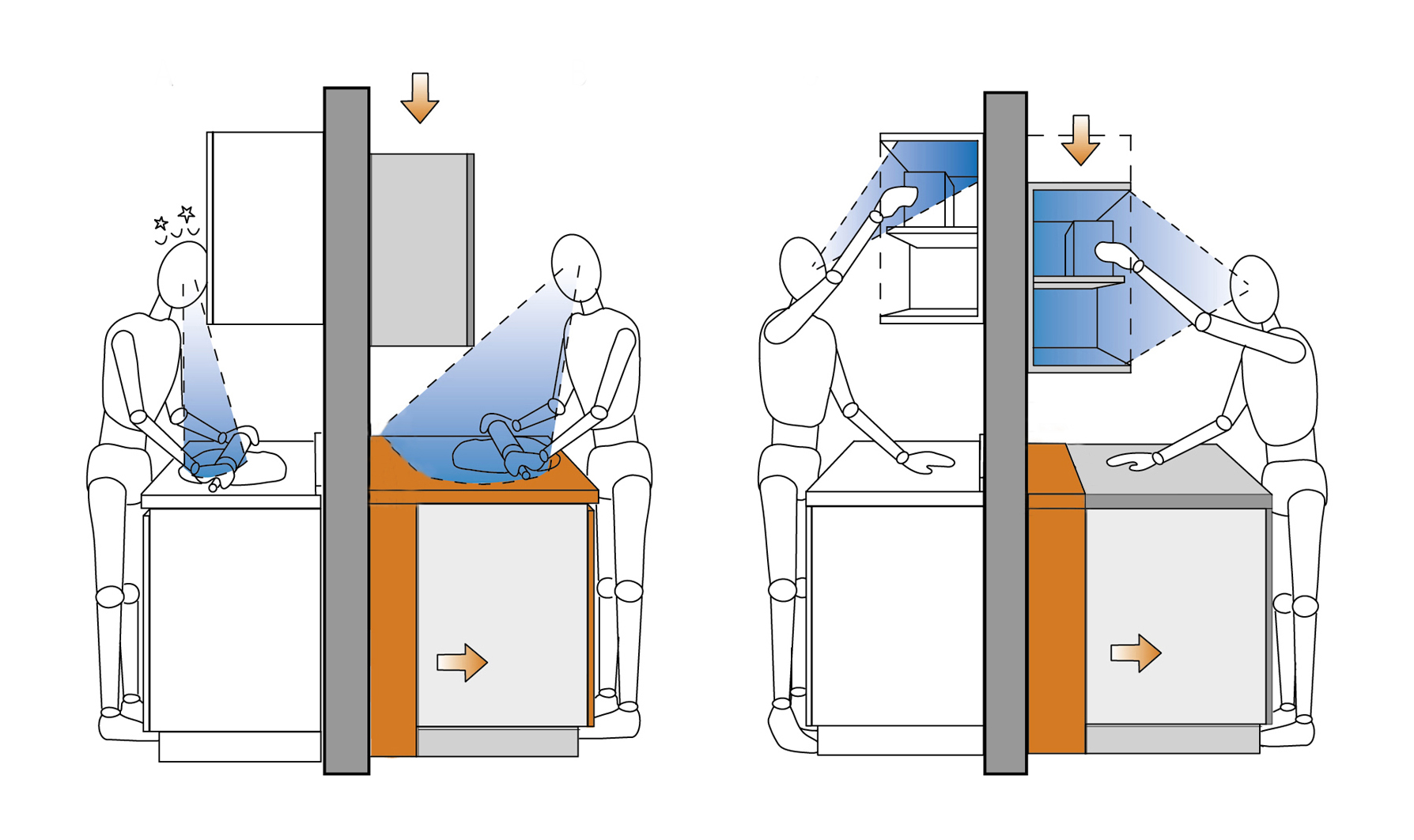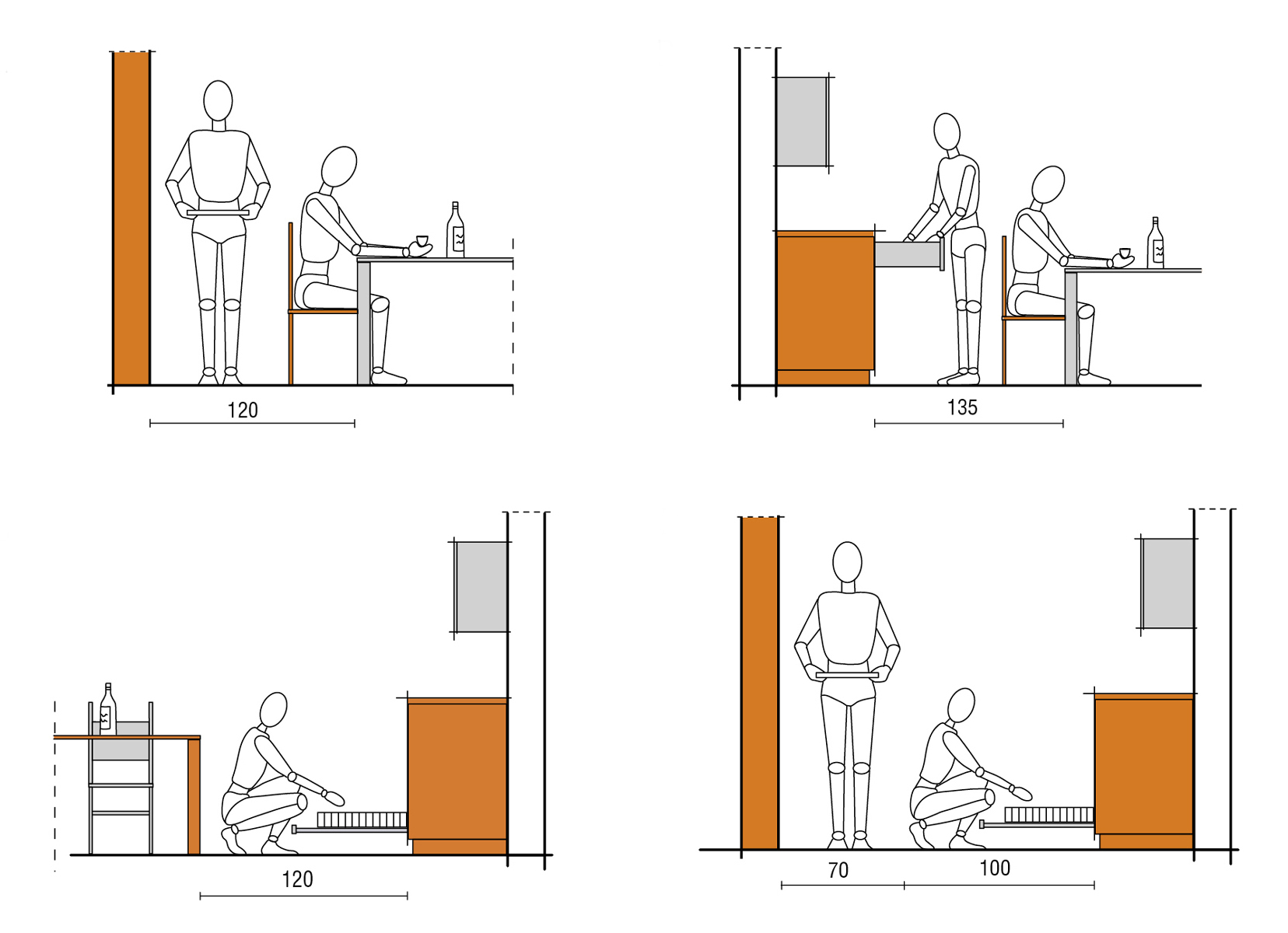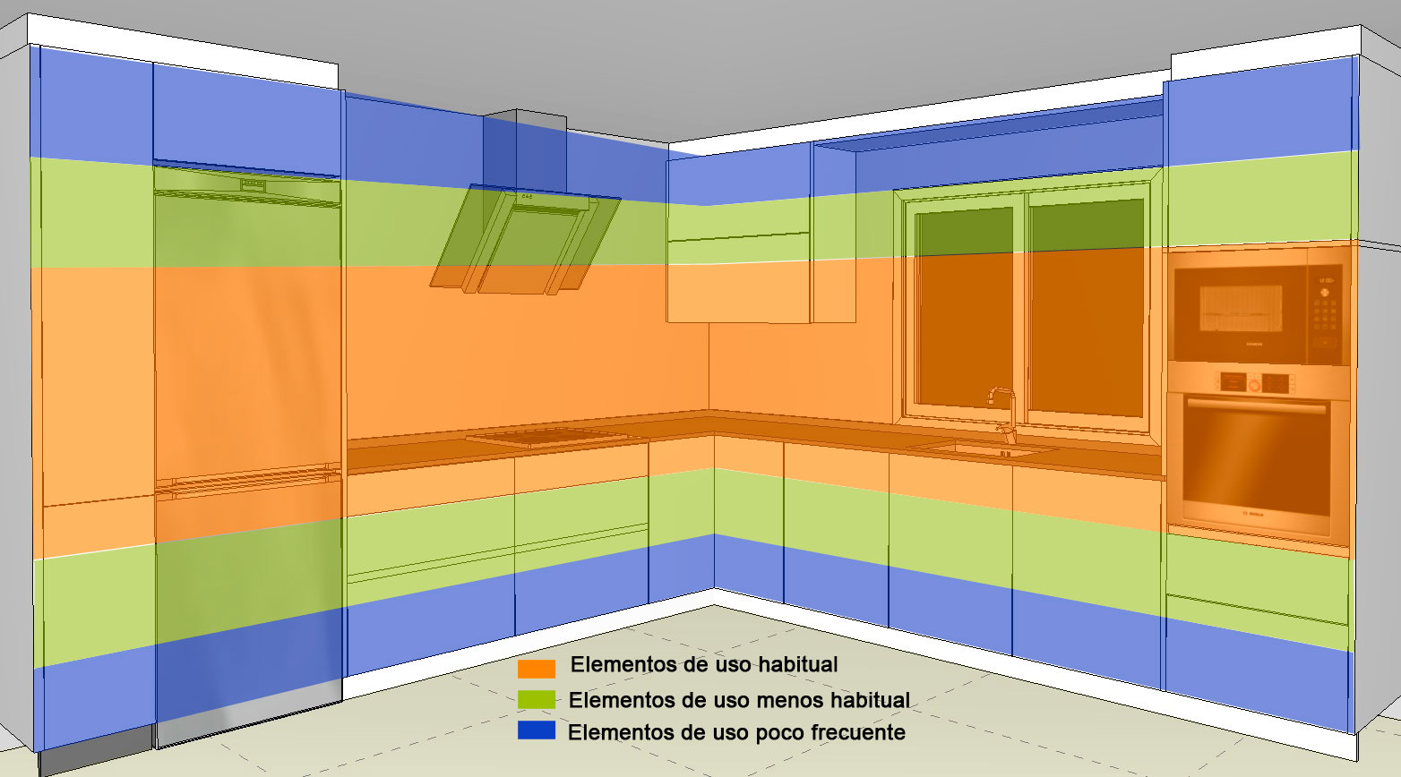 La altura del horno, del fregadero y del frigorífico debe estar adaptada a la estatura para evitar molestias físicas duraderas. También el interior de los armarios  se deben configurar de forma apropiada. Por ejemplo con cestas o fondos extraíbles igual que y los módulos altos deben  montarse con sistemas de alzamiento apropiados y a la altura de la vista. Debemos respetar también las distancias mínimas de paso para que la cocina y el espacio en general sean completamente funcionales.