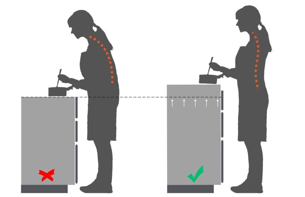 Un trabajo de pie delante de la encimera obliga a asumir posturas que pueden ser incorrectas. Por ello debemos pensar en la altura de la encimera. La altura estándar ha evolucionado con el tiempo y hay soluciones para adaptar la altura de la encimera a la del usuario combinando la altura de zócalo, la del módulo bajo y la de la bancada.