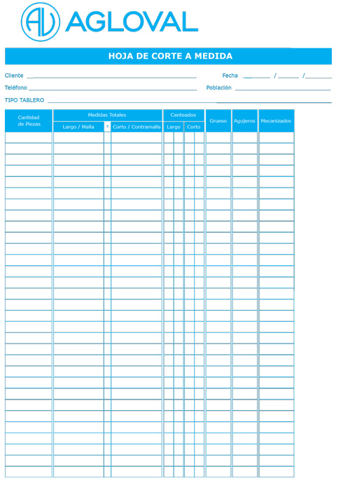 Desde AGLOVAL queremos facilitarte el trabajo, es por eso que ponemos a tu disposición este archivo en descarga con el que completar la información que nos das en las solicitudes de pedido. En esta sencilla plantilla de HOJA DE CORTE A MEDIDA, solicitamos todos los datos que consideramos necesarios para realizar correctamente todos los procesos de trabajo (Corte, Canteado, Mecanizado…)