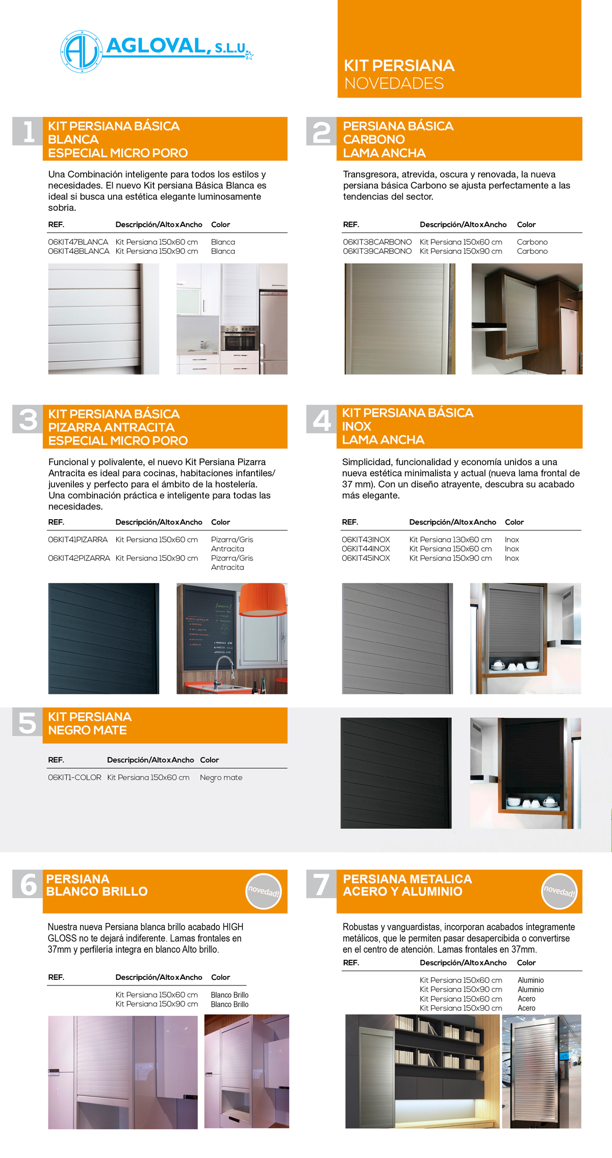 Agloval os presenta los nuevos Kit de Persianas. Ahora, por ejemplo, ya están disponibles en acabado Blanco Brillo, acabado Metálico Aluminio o con efecto Pizarra. Estos, y otros nuevos acabados, se incorporan a la ya amplia gama de soluciones disponibles. Dale un vistazo y ponte en contacto con nuestro equipo comercial para más información.