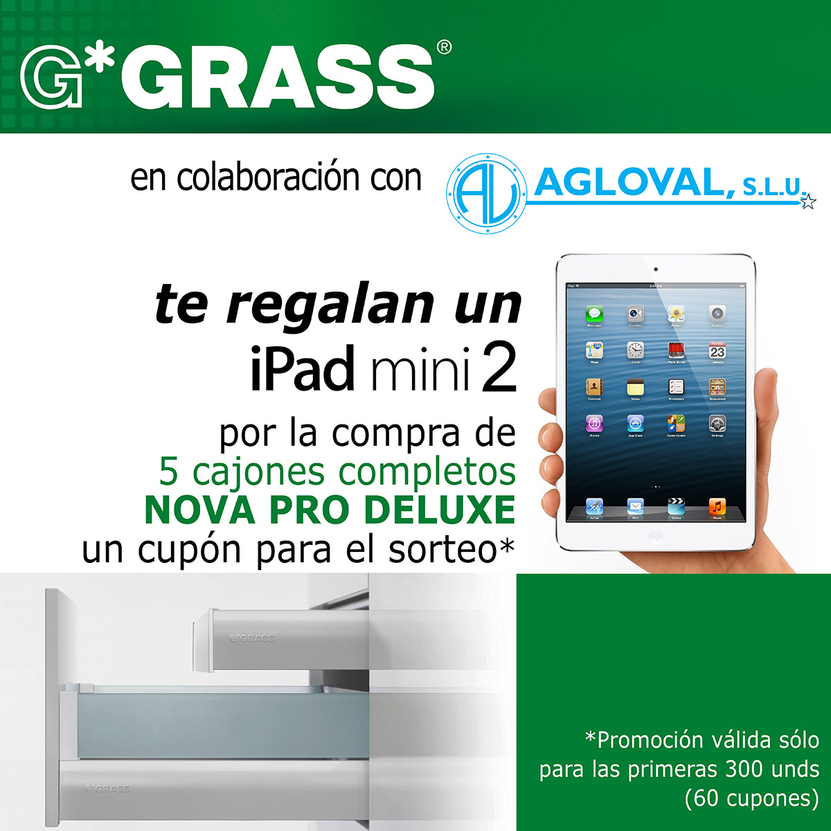 Por la compra de 5 cajones GRASS Nova Pro Deluxe te entregaremos un cupón con el que entrarás en el sorteo de un IPAD Mini de última generación. Agloval lanza esta magnífica promoción limitada sólo a los primeros 300 cajones, con lo que se repartirán sólo 60 cupones entre nuestros clientes.