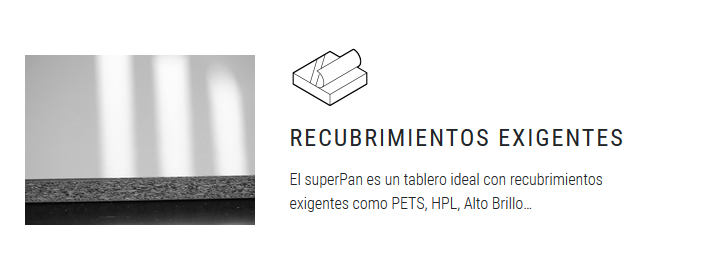 En resumen superPan es un tablero de altas prestaciones y diferenciador. Un tablero de última generación que abre nuevas posibilidades en el sector de decoración de interiores, mobiliario de cocina, hogar, baño y oficina; así como en la fabricación de stands y sector contract. Descubre en este link todos los sectores de aplicación para este nuevo tablero.