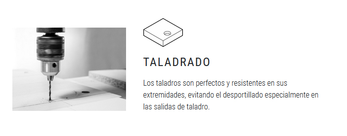 Otra de sus principales mejoras reside en su recubrimiento de melamina con el que se obtiene un corte perfecto. Se Como resultado se reduce notablemente el esportillado superficial y aumenta la vida útil de las herramientas de corte.